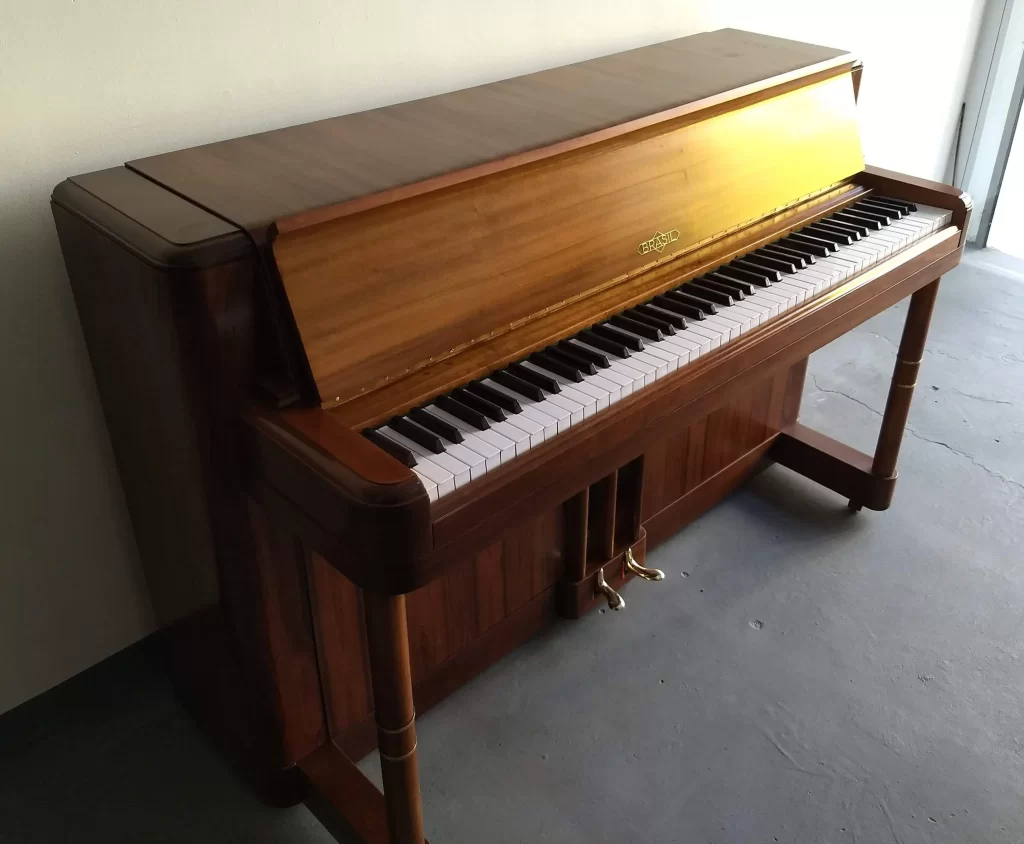Casa Levy Restauração e Reforma de Pianos Piano Brasil Modelo Petit Serviços feitos no piano. Revisão mecânica completa. Troca de contra martelos, embuchamentos, molas, correias e pivôs. Regulagem, lubrificação . Polimento e entonação da marteleira (original do piano). Troca de teclado. Remoção do verniz antigo e aplicação de novo acabamento em acetinado semi brilho.